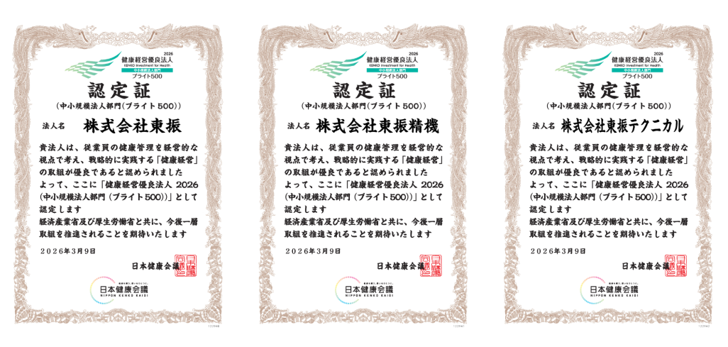 東振グループ3社(株式会社東振、株式会社東振精機、株式会社東振テクニカル)は、「健康経営優良法人2026(中小規模法人部門)」*において、上位500社が認定される「ブライト500」に認定されました。東振グループ3社のブライト500認定は、4年連続4回目となります。