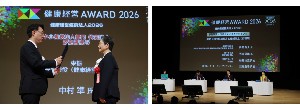 また、健康経営優良法人認定企業の発表に合わせて2026年3月11日(水)に開催された「健康経営AWARD2026」(主催:日本健康会議、共催:経済産業省・健康経営優良法人認定事務局(日本経済新聞社))において、認定中小企業約2万3千社を代表して認定証授与・パネルディスカッションでの事例発表を担当しました。